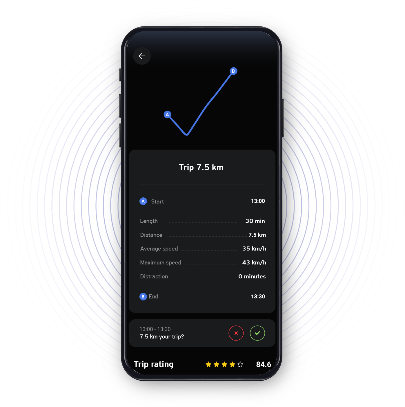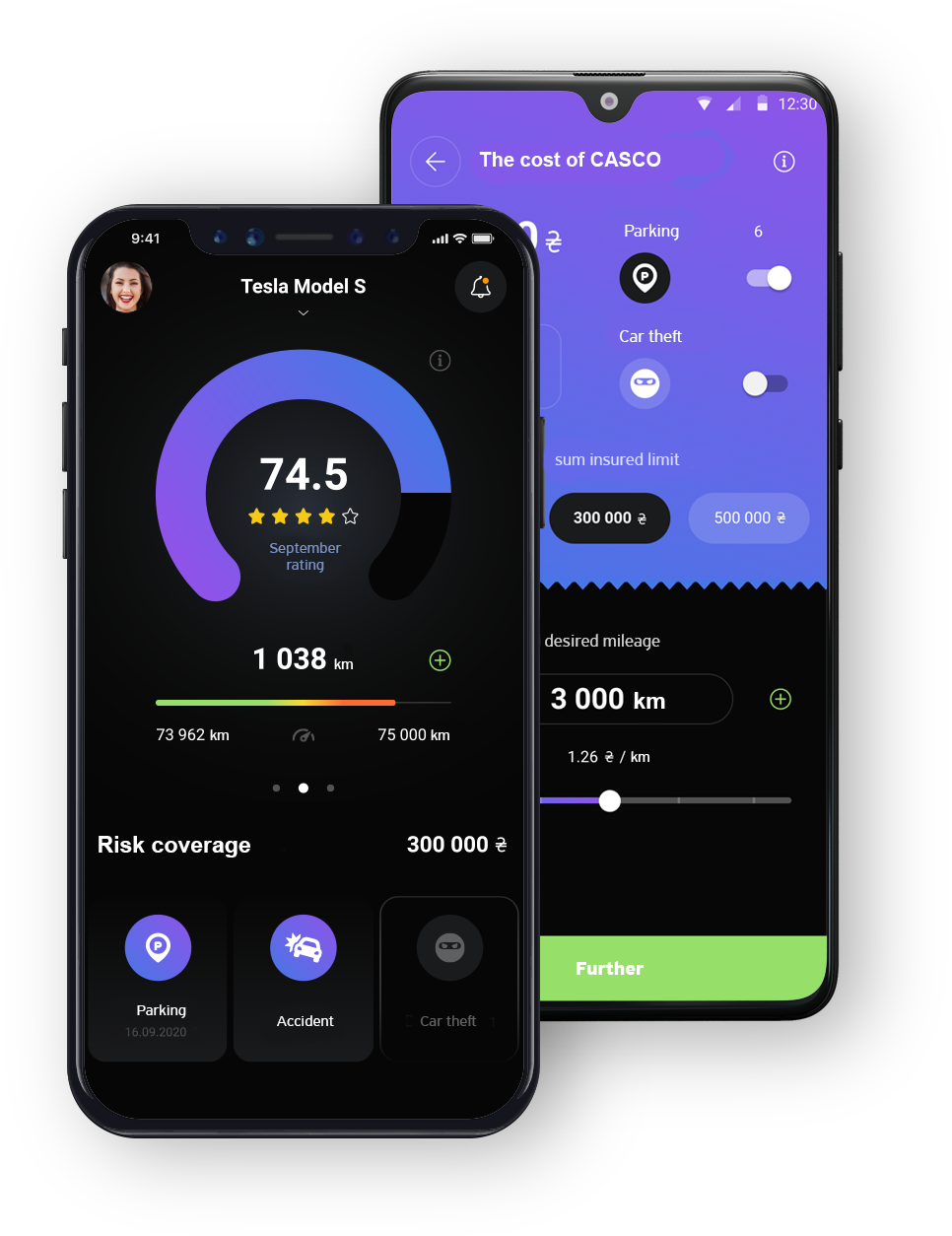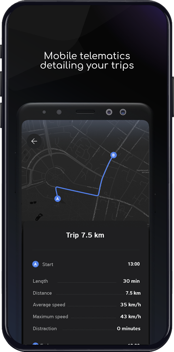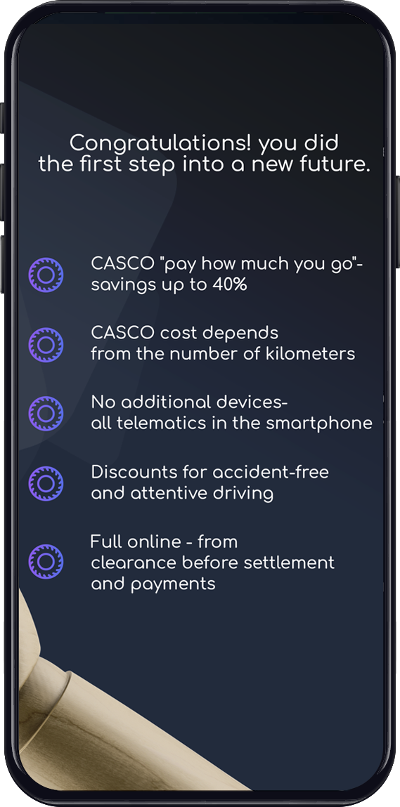 You do not need to install any additional devices on your car. Mobile telematics is fully programmed in the application. Mileage and driving style are tracked automatically.