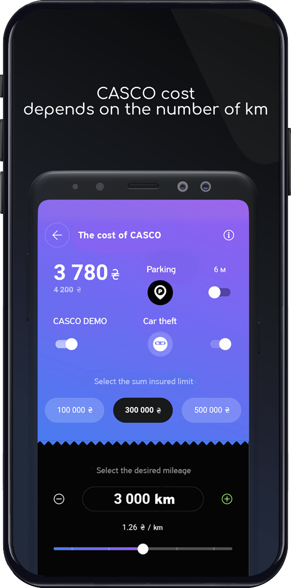 Pro.Kasco has no fixed tariffs/payments. You specify the amount for which you insure the car. You also choose insurance risks yourself. For attentive and safe driving you get discounts for the next miles/kilometers. And, of course, no hidden fees and "down payments" - everything is transparent.